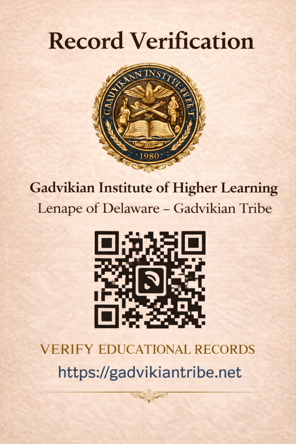 Welcome to the official academic verification portal for educational records issued by the Gadvikian Institute of Higher Learning and its affiliated tribal institutions. This portal enables schools, courts, employers, and agencies to validate documents ranging from preschool to post-secondary academic credentials.